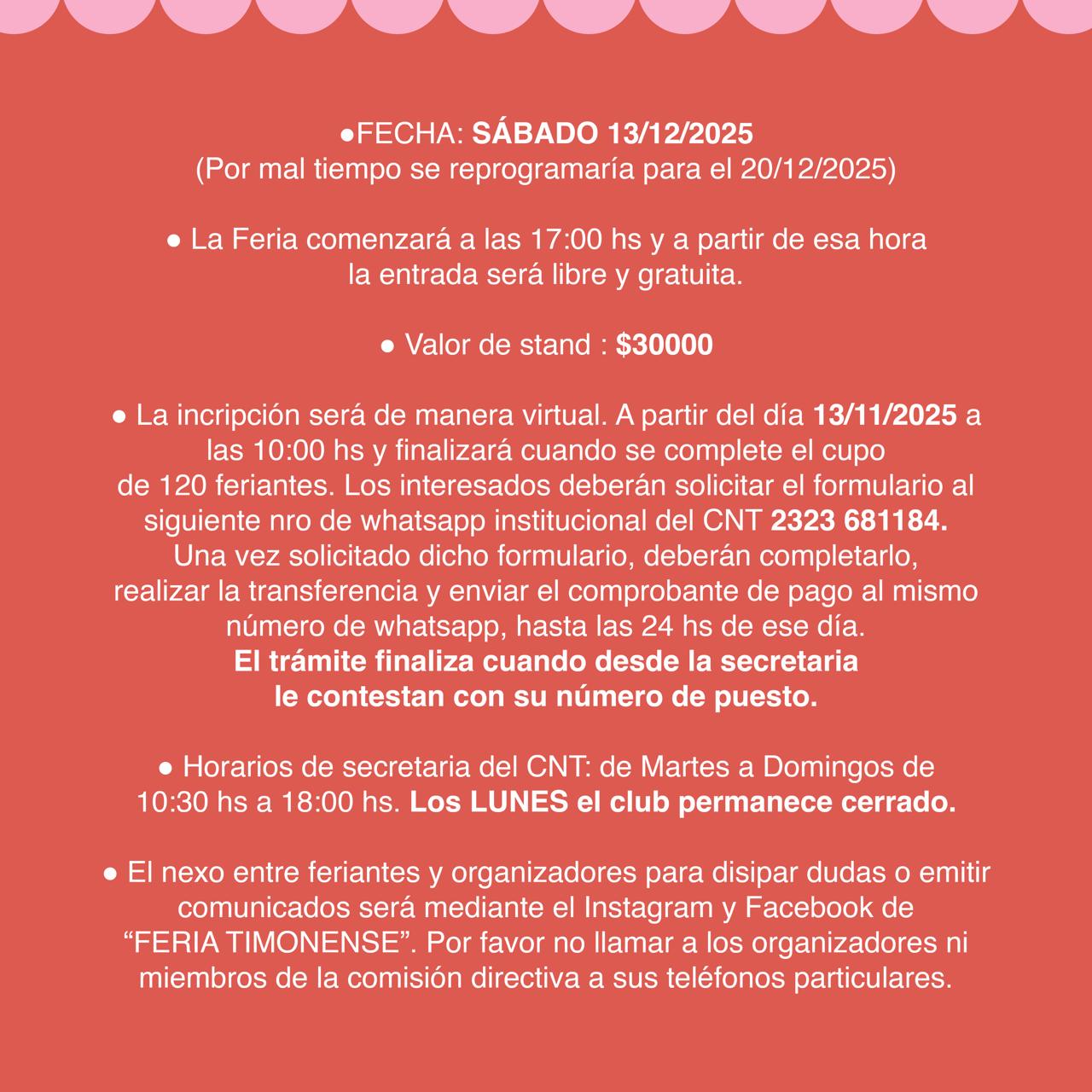 ¡Falta poco!   Próximamente abrirá la inscripción para la Feria Timonense 2025!   Cualquier duda, consultanos al WhatsApp del Club.